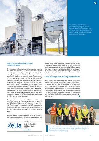 AAC WORLDWIDE %u2022 3.2025 NEWS & MARKET 11The plant has also developed a process for recycling the powder residues remaining from production. For this purpose, it was necessary to modify the AAC formulation and set up appropriate equipment.Xella France also welcomed Saint Savin City Council officials this year to discuss the plant%u2019s sustainability efforts and progress in corporate social responsibility.Improved sustainability through innovative ideasTo reintegrate leftovers into the production process, the plant has invested %u20ac1.1 million overall in a new shredding and screening machine just outside the facility. This equipment enables it to recycle as much production leftovers as possible locally, particularly in AAC production, where over 50% of the total leftovers are reused. This also helps reduce transport costs and CO%u2082 emissions by 50%. Through this step, Xella France aims to save %u20ac350,000 annually by reusing its own materials while not having to buy and thus conserving natural resources that would normally be part of the product recipe. In fact, the results have exceeded expectations, with transportation costs reduced by 60%, translating to a decrease of 1,015 tons of CO%u2082 e per year.Today, the crusher processes 50 tons of leftovers daily, producing 25 tons of powder and 25 tons of pre-granulates. \der, unlike sand, is already crushed. Additionally, there%u2019s a significant positive impact on the safety of our handling and transport teams,\Ray.Looking ahead, the plant%u2019s goal is to invest further in the crusher to enable it to sell the aggregates. This Xella FranceRte de Pr%u00e9 Ch%u00e2telain38300 Saint-SavinFrancewww.xella.frwould mean that production scraps are no longer considered waste to be disposed of but rather valuable aggregates to be commercialized. Once again, the plant is turning a limitation into an opportunity and can take pride in developing this innovative solution independently.Close exchange with the city administrationXella France also welcomed Saint Savin City Council officials this year to discuss the plant%u2019s sustainability efforts and progress in corporate social responsibility. The meeting covered topics including Xella%u2019s CSR strategy, advancements in recycling and waste reclamation, partnerships for responsible material recovery, efforts to reduce CO%u2082 emissions, and initiatives for local biodiversity conservation and renewable energy. %u25cf