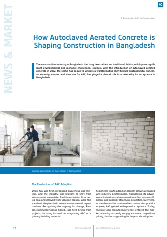 NEWS & MARKET12 NEWS & MARKET AAC WORLDWIDE %u2022 3.2025A Sustainable Shift in ConstructionHow Autoclaved Aerated Concrete is Shaping Construction in BangladeshThe construction industry in Bangladesh has long been reliant on traditional bricks, which pose significant environmental and economic challenges. However, with the introduction of autoclaved aerated concrete in 2022, the sector has begun to witness a transformative shift toward sustainability. Rancon, as an early adopter and advocate for AAC, has played a pivotal role in accelerating its acceptance in Bangladesh.The Evolution of AAC AdoptionWhen AAC was first introduced, awareness was minimal, and the industry was hesitant to shift from conventional materials. Traditional bricks, fired using coal and derived from valuable topsoil, were the standard, despite their severe environmental repercussions. Recognizing the urgency for change, Rancon eliminated topsoil-based, coal-fired bricks from projects, focusing instead on integrating AAC as a primary building material.As pioneers in AAC adoption, Rancon actively engaged with industry professionals, highlighting its advantages, including environmental benefits, energy efficiency, and superior structural properties. Over time, as the demand for sustainable construction practices grew, AAC gained widespread acceptance. Today, multiple local manufacturers have entered the market, ensuring a steady supply and more competitive pricing, further supporting its large-scale adoption.Typical application of AAC blocks in Bangladesh