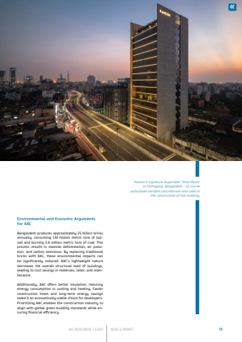 AAC WORLDWIDE %u2022 3.2025 NEWS & MARKET 13Environmental and Economic Argumentsfor AACBangladesh produces approximately 25 billion bricks annually, consuming 130 million metric tons of topsoil and burning 5.6 million metric tons of coal. This process results in massive deforestation, air pollution, and carbon emissions. By replacing traditional bricks with AAC, these environmental impacts can be significantly reduced. AAC%u2019s lightweight nature decreases the overall structural load of buildings, leading to cost savings in materials, labor, and maintenance.Additionally, AAC offers better insulation, reducing energy consumption in cooling and heating. Faster construction times and long-term energy savings make it an economically viable choice for developers. Prioritizing AAC enables the construction industry to align with global green building standards while ensuring financial efficiency.Rancon%u2019s signature skyscraper %u2018Khan Plaza%u2019 in Chittagong, Bangladesh - of course autoclaved aerated concrete was also used in the construction of this building.