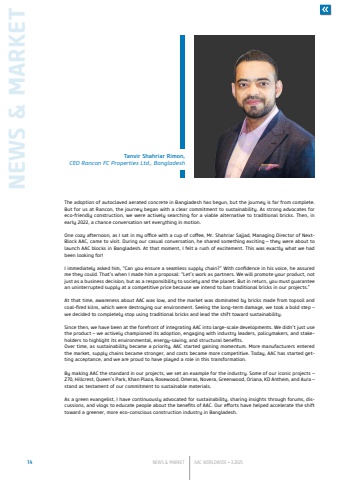 14 NEWS & MARKET AAC WORLDWIDE %u2022 3.2025NEWS & MARKETThe adoption of autoclaved aerated concrete in Bangladesh has begun, but the journey is far from complete. But for us at Rancon, the journey began with a clear commitment to sustainability. As strong advocates for eco-friendly construction, we were actively searching for a viable alternative to traditional bricks. Then, in early 2022, a chance conversation set everything in motion.One cozy afternoon, as I sat in my office with a cup of coffee, Mr. Shahriar Sajjad, Managing Director of NextBlock AAC, came to visit. During our casual conversation, he shared something exciting %u2013 they were about to launch AAC blocks in Bangladesh. At that moment, I felt a rush of excitement. This was exactly what we had been looking for!I immediately asked him, %u201cCan you ensure a seamless supply chain?%u201d With confidence in his voice, he assured me they could. That%u2019s when I made him a proposal: %u201cLet%u2019s work as partners. We will promote your product, not just as a business decision, but as a responsibility to society and the planet. But in return, you must guarantee an uninterrupted supply at a competitive price because we intend to ban traditional bricks in our projects.%u201dAt that time, awareness about AAC was low, and the market was dominated by bricks made from topsoil and coal-fired kilns, which were destroying our environment. Seeing the long-term damage, we took a bold step %u2013 we decided to completely stop using traditional bricks and lead the shift toward sustainability.Since then, we have been at the forefront of integrating AAC into large-scale developments. We didn%u2019t just use the product %u2013 we actively championed its adoption, engaging with industry leaders, policymakers, and stakeholders to highlight its environmental, energy-saving, and structural benefits.Over time, as sustainability became a priority, AAC started gaining momentum. More manufacturers entered the market, supply chains became stronger, and costs became more competitive. Today, AAC has started getting acceptance, and we are proud to have played a role in this transformation.By making AAC the standard in our projects, we set an example for the industry. Some of our iconic projects %u2013 Z70, Hillcrest, Queen%u2019s Park, Khan Plaza, Rosewood, Omeras, Novera, Greenwood, Oriana, KD Anthem, and Aura %u2013stand as testament of our commitment to sustainable materials.As a green evangelist, I have continuously advocated for sustainability, sharing insights through forums, discussions, and vlogs to educate people about the benefits of AAC. Our efforts have helped accelerate the shift toward a greener, more eco-conscious construction industry in Bangladesh.Tanvir Shahriar Rimon, CEO Rancon FC Properties Ltd., Bangladesh