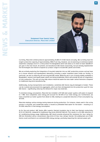 NEWS & MARKET16 NEWS & MARKET AAC WORLDWIDE %u2022 3.2025Currently, Maxcrete Limited produces approximately 35,000 m3 of AAC blocks annually. We currently have the largest production capacity of approximately 1000 m3 per day. However, we are planning an extensive market awareness campaign since it%u2019s a new product for Bangladesh which will allow us to reach at least 240,000 m3per year in the near future. At present, we manufacture AAC blocks exclusively, but we already implemented the technologies and intend to expand our product range to include AAC panels and lintels.We are actively exploring the integration of recycled materials into our AAC production process and we have an in house research and development laboratory including a water treatment plant inside our facility. In particular, we aim to utilize fly ash and recycled AAC waste. While fly ash is not currently widely available in Bangladesh, several coal-based power plants are being established, which will provide fly ash as a byproduct of coal combustion. This will not only help reduce industrial waste but also lower carbon emissions compared to traditional clay brick manufacturing.Additionally, during transportation and installation, sometimes AAC blocks may be damaged or broken. These can be crushed and processed into aggregates, which are then reintegrated into the production cycle for new AAC blocks %u2013 significantly reducing the demand for virgin raw materials.To minimize energy consumption, Maxcrete has installed a 357 kW solar power system, with plans to expand to 1 MW. Once completed, solar energy will account for 30%u201335% of our total energy use. Furthermore, we have converted our boiler system from diesel to CNG, leading to a projected reduction of fuel consumption by 30%u201335%.Maxcrete employs various energy-saving measures during production. For instance, steam used in the curing process is recycled, and condensate water is reused as preheated feed water for the boiler %u2013 resulting in a 25%u201330% reduction in fuel energy consumption.As for the end product, AAC blocks offer superior thermal insulation due to their low thermal conductivity (0.12%u20130.15 W/m%u00b7K), compared to traditional clay bricks (0.8%u20130.81 W/m%u00b7K). This results in a 25%u201330% reduction in air conditioning energy usage. Additionally, AAC blocks provide enhanced fire resistance (4+ hour rating for 200 mm thickness) versus conventional clay bricks (2 hour max rating). Overall, the widespread use of AAC blocks could contribute to an estimated 30% energy savings, positively impacting the national power grid.Statement from Samiul Islam, Executive Director, Maxcrete Limited