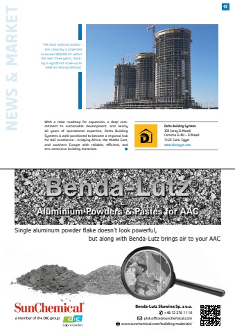 NEWS & MARKET22 NEWS & MARKET AAC WORLDWIDE %u2022 3.2025With a clear roadmap for expansion, a deep commitment to sustainable development, and nearly 40 years of operational expertise, Delta Building Systems is well-positioned to become a regional hub for AAC excellence %u2013 bridging Africa, the Middle East, and southern Europe with reliable, efficient, and eco-conscious building materials.%u00a0 %u25cfDelta Building Systems35B Saray El-Maadi,Corniche El-Nil %u2013 El Maadi11431 Cairo, Egyptwww.dbsegypt.comThe total national production capacity is projected to exceed 800,000 m%u00b3 within the next three years, marking a significant scale-up to meet increasing demand.Single aluminum powder flake doesn%u2019t look powerful,but along with Benda-Lutz brings air to your AACBenda-Lutz Skawina Sp. z o.o.+48 12 276 11 10plsk.ofi ce@sunchemical.comwww.sunchemical.com/building-materials/Aluminium Powders & Pastes for AAC