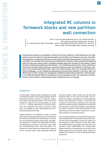 SCIENCE & INNOVATION24 SCIENCE & INNOVATION AAC WORLDWIDE %u2022 3.2025Innovative approaches for earthquake-resistant constructions with AACIntegrated RC columns in formwork blocks and new partition wall connectionComprehensive solutions are available to enhance the seismic resilience of load-bearing and non-loadbearing structures made from autoclaved aerated concrete (AAC) in earthquake-prone areas. One effective approach is to integrate reinforced concrete columns into AAC formwork blocks at the ends of structural walls. This enhances their load-bearing and deformation capacities. When positioned strategically within the floor plan, these columns strengthen individual walls and contribute to the building%u2019s overall structural integrity by enabling box-like behaviour. This significantly improves the seismic performance of the entire structure without altering conventional masonry construction methods. Furthermore, damage to non-load-bearing partition walls under out-of-plane loading, which was commonly observed in recent earthquakes, can be mitigated by adequately connecting these elements to the floor slabs. The effectiveness of these solutions has already been validated through shaking table tests conducted within the ECORE (Earthquake Efficient and Resilient Concrete Buildings) project. The application and effectiveness of the solutions is demonstrated using a detached house as an example.Prof. Dr.-Ing. Christoph Butenweg and Dr.-Ing. Thomas Kubalski, SDA-engineering GmbH, Herzogenrath, Germany  Dr. Lorenzo Miccoli, Xella Technologie- und Forschungsgesellschaft mbH, Kloster Lenin, Germany  Markus He%u00dfe, Xella Baustoffe GmbH, Duisburg, GermanyIntroductionIn recent years, there has been a significant increase in demand for modern multi-storey buildings made of autoclaved aerated concrete for economic, spatial, social and urban planning reasons. The construction method of a typical multi-storey building, as shown in Figure 1, requires high levels of structural resistance, fire protection and sound insulation, which must be provided by both load-bearing and nonload-bearing partition walls.Integral solutions are available to meet structural requirements in earthquake-prone areas and improve the seismic performance of load-bearing structures and non-load-bearing walls made of AAC. One effective approach to increase the earthquake resistance of load-bearing structures consisting of shear walls and load-distributing floors with ring beams is to enhance the load-bearing and deformation capacity of the structural walls using integrated reinforced concrete columns. These columns are cast into AAC formwork blocks at the ends of the walls. The targeted and regular arrangement of these additional tension and compression columns in the floor plan increases the load-bearing capacity of the individual walls and achieves greater compactness through the box behaviour of the overall building. Consequently, the seismic resistance of the entire structure can be significantly enhanced without altering the conventional masonry construction process.The increased damage to non-load-bearing partition walls perpendicular to their plane that occurred during the recent earthquakes in Italy and T%u00fcrkiye can be avoided by a rigid connection to the floor slabs. The implementation and design principles of the two solutions, whose effectiveness has already been demonstrated by a shaking table tests as part of the ECORE project [4], are presented below. Finally, an example from practice is used to demonstrate their application.