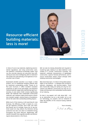 AAC WORLDWIDE %u2022 3.2025 EDITORIAL 3In times of scarce raw materials, tightening environmental regulations, and rising construction costs, one question is becoming increasingly urgent: how can the concrete industry not only work more efficiently but also more intelligently with its materials? The answer lies quite literally in the lightness of construction: less is more!Autoclaved aerated concrete is no longer a niche product, but an established building material with an impressive sustainability profile. Thanks to its fine pore structure, it offers excellent insulation properties as well as low self-weight, and therefore reduced material usage while maintaining high functionality. A cubic meter of AAC contains significantly fewer raw materials than comparable construction materials, yet it delivers higher performance criteria: less transport weight, reduced loads on foundations, and at the same time outstanding building physics.While much of the industry is still searching for new formulas, the efficiency of AAC is based on a simple yet ingenious principle: more voids, less mass. And therein lies its strength. Every ton of raw material saved not only reduces CO%u2082 emissions during production but also cuts down on embodied energy throughout the entire lifecycle. Additionally, AAC stands to benefit from ongoing scientific and technological advancements in the future.AAC can also be cleanly dismantled and recycled or reused by type, making it an ideal material in the context of a circular construction economy. The material%u2019s combined characteristics of lightweight construction, superior thermal performance, and resource conservation remain unique amongst other building construction technologies.Now more than ever, it is time to bring these advantages to the forefront %u2013 in dialogue with architects, planners, developers, and decision-makers. Those who choose AAC today are opting not only for economical and efficient construction but also for actively contributing to the sustainable transformation of our industry.So here is my appeal: Let%u2019s talk about AAC %u2013 not as an alternative, but as a role model. Let us use our technology, our projects, and our networks to make the benefits of this resource-saving material more visible.Yours sincerely,Resource-efficient building materials: less is more!Editor-in-ChiefDipl.-Ing. (FH) Michael von Ahleneditorial