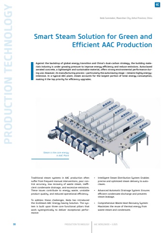 PRODUCTION TECHNOLOGY30 PRODUCTION TECHNOLOGY AAC WORLDWIDE %u2022 3.2025Keda Suremaker, Maanshan City, Anhui Province, ChinaSmart Steam Solution for Green and Efficient AAC ProductionAgainst the backdrop of global energy transition and China%u2019s dual-carbon strategy, the building materials industry is under growing pressure to improve energy efficiency and reduce emissions. Autoclaved aerated concrete, a lightweight and sustainable material, offers strong environmental performance dur,ing use. However, its manufacturing process %u2013 particularly the autoclaving stage %u2013 remains highly energyintensive. In a typical AAC plant, steam accounts for the largest portion of total energy consumption, making it the top priority for efficiency upgrades.Traditional steam systems in AAC production often suffer from frequent manual interventions, poor control accuracy, low recovery of waste steam, inefficient condensate drainage, and excessive emissions. These issues contribute to energy waste, unstable product quality, and reduced operational efficiency.To address these challenges, Keda has introduced the EcoSteam AAC Energy-Saving Solution. The system is built upon three core functional pillars that work synergistically to deliver exceptional performance:%u2022 Intelligent Steam Distribution System: Enables precise and optimized steam delivery to autoclaves.%u2022 Advanced Automatic Drainage System: Ensures efficient condensate discharge and prevents steam leakage.%u2022 Comprehensive Waste Heat Recovery System: Maximizes the reuse of thermal energy from waste steam and condensate.Steam is the core energy in AAC Plant