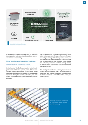 AAC WORLDWIDE %u2022 3.2025 PRODUCTION TECHNOLOGY 31It represents a strategic upgrade path for manufacturers pursuing both operational excellence and environmental sustainability.Three Core Systems Supporting EcoSteamIntelligent Steam Distribution SystemAt the heart of the EcoSteam solution is the intelligent steam distribution system, which delivers precise and stable steam supply to autoclaves. Unlike traditional setups that rely heavily on manual valve operation, this system enables automated, real-time control of steam flow and pressure based on process demands.The system employs a unique combination of regulating valves and shut-off valves. The shut-off valves ensure tight sealing, while the regulating valves provide precise control with an accuracy of up to 0.1%. This configuration not only optimizes steam regulation but also guarantees excellent sealing, leading to reduced steam consumption and lower long-term maintenance costs.This intelligent distribution not only improves energy efficiency by avoiding over- or under-supply of steam but also ensures consistent pressure across multiple autoclaves %u2013 critical for stable curing and product quality.Keda AAC EcoSteam SolutionKeda uses advanced 3D software for HVAC piping design to make sure the accuracy.