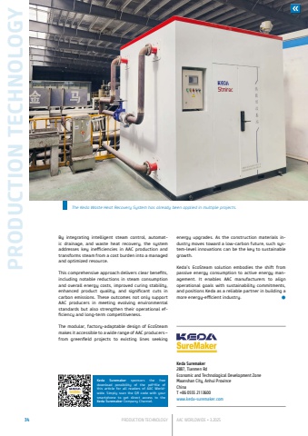 PRODUCTION TECHNOLOGY34 PRODUCTION TECHNOLOGY AAC WORLDWIDE %u2022 3.2025By integrating intelligent steam control, automatic drainage, and waste heat recovery, the system addresses key inefficiencies in AAC production and transforms steam from a cost burden into a managed and optimized resource.This comprehensive approach delivers clear benefits, including notable reductions in steam consumption and overall energy costs, improved curing stability, enhanced product quality, and significant cuts in carbon emissions. These outcomes not only support AAC producers in meeting evolving environmental standards but also strengthen their operational efficiency and long-term competitiveness.The modular, factory-adaptable design of EcoSteam makes it accessible to a wide range of AAC producers %u2013from greenfield projects to existing lines seeking energy upgrades. As the construction materials industry moves toward a low-carbon future, such system-level innovations can be the key to sustainable growth.Keda%u2019s EcoSteam solution embodies the shift from passive energy consumption to active energy management. It enables AAC manufacturers to align operational goals with sustainability commitments, and positions Keda as a reliable partner in building a more energy-efficient industry. %u25cfKeda Suremaker sponsors the free download possibility of the pdf-file of this article for all readers of AAC Worldwide. Simply scan the QR code with your smartphone to get direct access to the Keda Suremaker Company Channel.Keda Suremaker2887, Tianmen Rd Economic and Technological Development ZoneMaanshan City, Anhui ProvinceChinaT +86 0555 2113600www.keda-suremaker.comThe Keda Waste Heat Recovery System has already been applied in multiple projects.