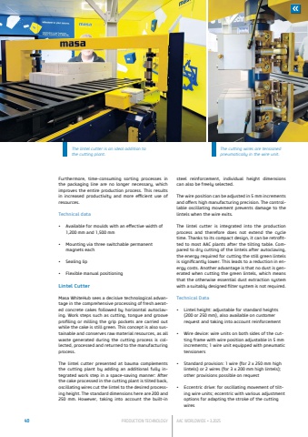 40 PRODUCTION TECHNOLOGY AAC WORLDWIDE %u2022 3.2025Furthermore, time-consuming sorting processes in the packaging line are no longer necessary, which improves the entire production process. This results in increased productivity and more efficient use of resources.Technical data%u2022 Available for moulds with an effective width of 1,200 mm and 1,500 mm%u2022 Mounting via three switchable permanent magnets each%u2022 Sealing lip%u2022 Flexible manual positioning Lintel CutterMasa WhiteHub sees a decisive technological advantage in the comprehensive processing of fresh aerated concrete cakes followed by horizontal autoclaving. Work steps such as cutting, tongue and groove profiling or milling the grip pockets are carried out while the cake is still green. This concept is also sustainable and conserves raw material resources, as all waste generated during the cutting process is collected, processed and returned to the manufacturing process.The lintel cutter presented at bauma complements the cutting plant by adding an additional fully integrated work step in a space-saving manner: After the cake processed in the cutting plant is tilted back, oscillating wires cut the lintel to the desired processing height. The standard dimensions here are 200 and 250 mm. However, taking into account the built-insteel reinforcement, individual height dimensions can also be freely selected.The wire position can be adjusted in 5 mm increments and offers high manufacturing precision. The controllable oscillating movement prevents damage to the lintels when the wire exits.The lintel cutter is integrated into the production process and therefore does not extend the cycle time. Thanks to its compact design, it can be retrofitted to most AAC plants after the tilting table. Compared to dry cutting of the lintels after autoclaving, the energy required for cutting the still green lintels is significantly lower. This leads to a reduction in energy costs. Another advantage is that no dust is generated when cutting the green lintels, which means that the otherwise essential dust extraction system with a suitably designed filter system is not required.Technical Data%u2022 Lintel height: adjustable for standard heights (200 or 250 mm), also available on customer request and taking into account reinforcement%u2022 Wire device: wire units on both sides of the cutting frame with wire position adjustable in 5 mm increments; 1 wire unit equipped with pneumatic tensioners%u2022 Standard provision: 1 wire (for 2 x 250 mm high lintels) or 2 wires (for 3 x 200 mm high lintels); other provisions possible on request%u2022 Eccentric drive: for oscillating movement of tilting wire units; eccentric with various adjustment options for adapting the stroke of the cutting wiresThe lintel cutter is an ideal addition to the cutting plant.The cutting wires are tensioned pneumatically in the wire unit.
