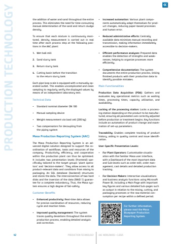 PRODUCTION TECHNOLOGY42 PRODUCTION TECHNOLOGY AAC WORLDWIDE %u2022 3.2025the addition of water and sand throughout the entire process. This eliminates the need for time-consuming manual determination of the sand and return sludge density.To ensure that each mixture is continuously monitored, density measurement is carried out in real time after each process step at the following positions in the AAC plant:1. Wet ball mill2. Sand slurry tank3. Return slurry tank4. Cutting basin before the transition to the return slurry tankEach pipe loop scale is equipped with a manually operated outlet. This enables uncomplicated and clean sampling to regularly verify the displayed values by means of an independent laboratory test.Technical Data%u2022 Standard nominal diameter DN 100%u2022 Manual sampling device%u2022 Weight measurement via load cell (200 kg)%u2022 Two compensators for decoupling from the piping systemMasa Production Reporting System (AAC)The Masa Production Reporting System is an advanced digital solution designed to support the coordination of workflows, tasks and resources of the company. Productivity, efficiency, and cooperation within the production plant can thus be optimised. It includes two presentation levels (frontend) specifically tailored to the target groups %u2018plant operators%u2019 and %u2018decision-makers%u2019. They allow access to all product-relevant data and conditions from mixing to packaging. An SQL database (backend) structures and stores the data. The interconnection of two hard disks and the inversion of the data (RAID 1) guarantee for a complete redundancy. Thus, the Masa system ensures a high degree of fail-safety.Customer Benefits%u2022 Enhanced productivity: Real-time data allows for precise coordination of resources, reducing cycle and reaction times.%u2022 Improved quality management: The system traces quality deviations throughout the entire production process, enabling detailed analysis and correction.%u2022 Increased automation: Various plant components automatically adapt themselves for product changes, reducing paper-based processes and human error.%u2022 Reduced administrative efforts: Centrally available data minimises manual recording and transmission, making information immediately accessible to decision-makers.%u2022 Efficient performance analyses: Prepared data enables the detection of strengths and weaknesses, helping to organize processes more efficiently.%u2022 Comprehensive documentation: The system documents the entire production process, linking finished products with their production data to identify possible mistakes.Main FunctionalitiesProduction Data Acquisition (PDA): Gathers and evaluates key operational metrics such as waiting times, processing times, capacity utilisation, and availability.Locking of the processing station: Locks a processing station depending on the product to be manufactured, ensuring all parameters are correctly adjusted before production or treatment begins. Key functions include an automation of product change and examination of set-up parameters.Traceability: Enables complete tracking of product history, aiding in quality control and issue identification.User-Specific Presentation Levels:%u2022 For Plant Operators: Customisable visualisation with the familiar Masa user interface, with a Dashboard of the most important data and Sub-levels such as order edit, order management, cast details and detailed production tracking.%u2022 For Decision Makers: Interactive visualisations and business analysis functions using Microsoft Power BI, including a Main Page with important key figures and various detailed Sub-pages such as output in relation to the mixing, cutting, and packaging processes or the raw material consumption per recipe within a defined period.For further information, please read the Masa Bluepaper Production Reporting System.