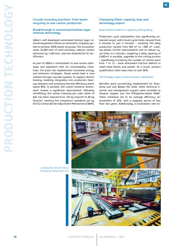 PRODUCTION TECHNOLOGY48 PRODUCTION TECHNOLOGY AAC WORLDWIDE %u2022 3.2025Circular economy practices: from waste recycling to low-carbon productionBreakthrough in autoclaved bottom layer removal technologyUBlok%u2019s self-developed autoclaved bottom layer removal equipment utilizes an automatic stripping system to achieve 100% waste recycling. This innovation saves 35,000 tons of sand annually, reduces carbon emissions by 1,200 tons, and has obtained EU CE certification.As part of UBlok%u00b4s commitment to low-carbon pathways and alignment with EU sustainability initiatives, the plant has implemented innovative energy and emissions strategies. Steam waste heat is now utilized through cascade systems to support district heating, enabling integration into production heating networks and achieving thermal efficiency levels above 85%. In parallel, the carbon footprint assessment reveals a significant improvement: following retrofitting, the carbon intensity per cubic meter of AAC has been reduced from 120 kg CO%u2082e/m%u00b3 to 80 kg CO%u2082e/m%u00b3, meeting the compliance standards set by the EU Carbon Border Adjustment Mechanism (CBAM).Changxing Plant: capacity leap and technology exportDual enhancement in capacity and qualityProduction cycle optimization has significantly enhanced output, with mould cycle times reduced from 6 minutes to just 3 minutes %u2013 doubling the daily production volume from 950 m%u00b3 to 1,900 m%u00b3. Looking ahead, further improvements aim to reduce cycle times to 2 minutes, targeting a daily capacity of 2,600 m%u00b3. In parallel, upgrades to the cutting process %u2013 specifically increasing the number of column pairs from 7 to 13 %u2013 have eliminated fracture defects in small-sized blocks and panels. As a result, product qualification rates have risen to over 99%.Technology export and economic validationRetrofits were successfully implemented for Shandong Lubi and Baowu Ma Steel, while technical licenses and management support were provided to Shaanxi Jingwei and the Philippines-based MVBC. These initiatives led to an average efficiency improvement of 35%, with a payback period of less than two years. Additionally, a localization rate ex- Automated retrofit site at Changxing Ytong plant [1].