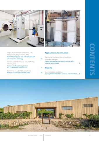AAC WORLDWIDE %u2022 3.2025 CONTENTS 5CONTENTSJiangsu Teeyer Intelligent Equipment Co., Ltd, Changzhou City, Jiangsu Province, ChinaThailand Diamond Group as a Local Forerunner with Green Separation Technology 60Shandong Sunite Machinery Co., Ltd., 276300 Linyi, Shandong, ChinaAdvanced AAC Manufacturing Centred on a 7.2-Meter Panel Production Line 64Wandwire Sp. z.o.o., 32-050 Skawina, PolandReady-to-use cutting wires for AAC plants 68Application & ConstructionExperimental investigation into earthquake and strong wind load casesCoupled autoclaved aerated concrete confined walls subjected to lateral loads 70ProjectsSmart Materials for Great WinesA winery that blends tradition, innovation, and sustainability 7852 7078