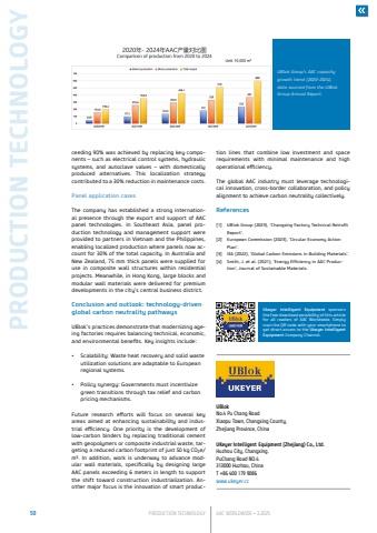 PRODUCTION TECHNOLOGY50 PRODUCTION TECHNOLOGY AAC WORLDWIDE %u2022 3.2025ceeding 90% was achieved by replacing key components %u2013 such as electrical control systems, hydraulic systems, and autoclave valves %u2013 with domestically produced alternatives. This localization strategy contributed to a 30% reduction in maintenance costs.Panel application casesThe company has established a strong international presence through the export and support of AAC panel technologies. In Southeast Asia, panel production technology and management support were provided to partners in Vietnam and the Philippines, enabling localized production where panels now account for 30% of the total capacity. In Australia and New Zealand, 75 mm thick panels were supplied for use in composite wall structures within residential projects. Meanwhile, in Hong Kong, large blocks and modular wall materials were delivered for premium developments in the city%u2019s central business district.Conclusion and outlook: technology-driven global carbon neutrality pathwaysUBlok%u2019s practices demonstrate that modernizing ageing factories requires balancing technical, economic, and environmental benefits. Key insights include:%u2022 Scalability: Waste heat recovery and solid waste utilization solutions are adaptable to European regional systems.%u2022 Policy synergy: Governments must incentivize green transitions through tax relief and carbon pricing mechanisms.Future research efforts will focus on several key areas aimed at enhancing sustainability and industrial efficiency. One priority is the development of low-carbon binders by replacing traditional cement with geopolymers or composite industrial waste, targeting a reduced carbon footprint of just 50 kg CO%u2082e/m%u00b3. In addition, work is underway to advance modular wall materials, specifically by designing large AAC panels exceeding 6 meters in length to support the shift toward construction industrialization. Another major focus is the innovation of smart production lines that combine low investment and space requirements with minimal maintenance and high operational efficiency.The global AAC industry must leverage technological innovation, cross-border collaboration, and policy alignment to achieve carbon neutrality collectively. References[1] UBlok Group (2023), %u2018Changxing Factory Technical Retrofit Report%u2019.[2] European Commission (2023), %u2018Circular Economy Action Plan%u2019.[3] IEA (2022), %u2018Global Carbon Emissions in Building Materials%u2019.[4] Smith, J. et al. (2021), %u2018Energy Efficiency in AAC Production%u2019, Journal of Sustainable Materials.Ukeyer Intelligent Equipment sponsors the free download possibility of this article for all readers of AAC Worldwide. Simply scan the QR code with your smartphone to get direct access to the Ukeyer Intelligent Equipment Company Channel.UBlok Group%u2019s AAC capacity growth trend (2020-2024), data sourced from the UBlok Group Annual Report.UKeyer Intelligent Equipment (Zhejiang) Co., Ltd.Huzhou City, Changxing.PuChang Road NO.4313000 Huzhou, ChinaT +86 400 179 9086www.ukeyer.ccUBlokNo.4 Pu Chang RoadXiaopu Town, Changxing County, Zhejiang Province, China