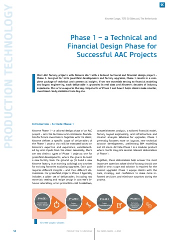 PRODUCTION TECHNOLOGY52 PRODUCTION TECHNOLOGY AAC WORLDWIDE %u2022 3.2025Aircrete Europe, 7575 EJ Oldenzaal, The NetherlandsPhase 1 %u2013 a Technical and Financial Design Phase for Successful AAC ProjectsMost AAC factory projects with Aircrete start with a tailored technical and financial design project %u2013 Phase 1. Designed for both greenfield developments and factory upgrades, Phase 1 results in a complete package of technical and commercial insights. From raw materials testing to financial modeling and layout engineering, each deliverable is grounded in real data and Aircrete%u2019s decades of industry experience. This article explores the key components of Phase 1 and how it helps clients make smarter, investment-ready decisions from day one.Introduction - Aircrete Phase 1Aircrete Phase 1 %u2013 a tailored design phase of an AAC project %u2013 sets the technical and commercial foundation for future investments. Together with the client, Aircrete defines a specific scope of deliverables of the Phase 1 project that will be executed based on Aircrete%u2019s expertise and experience, complemented by local inputs from the client. Generally, there are two distinct types of Phase 1 projects: one for greenfield developments, where the goal is to build a new facility from the ground up (or build a new Aircrete factory in an existing building), and another for existing factories exploring upgrades. Each path requires different insights %u2013 and thus, different deliverables. For greenfield projects, Phase 1 typically includes a wider set of deliverables, including raw materials testing and recipe design in Aircrete%u2019s inhouse laboratory, a full production cost breakdown, competitiveness analysis, a tailored financial model, factory layout engineering, and infrastructure and location analysis. Whereas for upgrades, Phase 1 generally focusses more on layouts, new technical solution developments, preliminary BIM modelling and 3D scans. Aircrete Phase 1 is a modular product where clients may pick several relevant deliverables of Phase 1.Together, these deliverables help answer the most important question: what kind of factory should one build or what scope and solution is required for the desired upgrade? Phase 1 equips clients with the data, strategy, and confidence to make more informed decisions and eliminate surprises during the project. Aircrete project phases