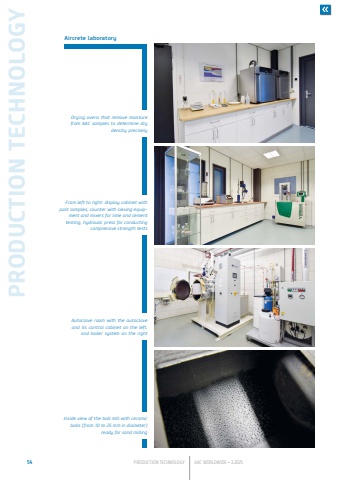 PRODUCTION TECHNOLOGY54 PRODUCTION TECHNOLOGY AAC WORLDWIDE %u2022 3.2025Aircrete laboratory Drying ovens that remove moisture from AAC samples to determine dry density preciselyAutoclave room with the autoclave and its control cabinet on the left, and boiler system on the rightInside view of the ball mill with ceramic balls (from 10 to 25 mm in diameter) ready for sand millingFrom left to right: display cabinet with past samples, counter with sieving equipment and mixers for lime and cement testing, hydraulic press for conducting compressive strength tests