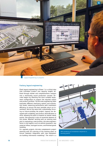56 PRODUCTION TECHNOLOGY AAC WORLDWIDE %u2022 3.2025Factory layout engineeringPlant layout engineering in Phase 1 is a critical step that translates product and capacity targets defined through market and competitiveness analysis into a technically sound production concept. Aircrete begins by selecting the most suitable equipment configuration to support the required output and product portfolio. The Aircrete engineering team evaluates different machinery options and automation levels, balancing performance with investment efficiency to ensure the best possible return on investment. And at the same time, undoubtedly, focusing on future-proofing the project: layouts are designed with scalability and product diversification in mind, allowing the plant to expand as market needs evolve. Site planning is also an essential element of this phase. Whether working with an existing land plot or evaluating a new location, Aircrete engineers factor in site logistics such as vehicle movement, raw material inflow, stockyard access, and finished goods handling.For upgrade projects, Aircrete complements project planning with 3D scanning of the existing plant to ensure seamless integration with new equipment via building information modelling1. The result is a Layout engineering in progressBIM modelling of installation sequence in existing plants