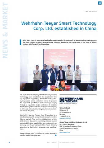 NEWS & MARKET6 NEWS & MARKET AAC WORLDWIDE %u2022 3.2025The joint venture company %u2018Wehrhahn Teeyer Smart Technology%u2019 was established to complement the key equipment supplied by Wehrhahn from Germany in projects where customers intend to procure the equipment specified as %u2018local%u2019 or %u2018buyer%u2019 supply through a reputable single contractor. It enables Wehrhahn together with the Joint Venture Company to offer cost-attractive turnkey solutions to customers around the globe.Wehrhahn%u00b4s partner Teeyer from Changzhou is a listed company with an excellent reputation in the Chinese market. Prior to the establishment of the joint venture, the parties commonly realized several projects. Wehrhahn supplied the key equipment from Germany and Teeyer completed the %u2018local%u2019 delivery according to Wehrhahn's drawings and specifications.Deeper co-operation in the form of a joint venture is now the logical consequence. %u25cfNew joint ventureWehrhahn Teeyer Smart Technology Corp. Ltd. established in ChinaAfter more than 20 years as a leading European supplier of equipment for autoclaved aerated concrete and fibre cement in China, Wehrhahn now solemnly announces the cooperation in the form of a joint venture with Teeyer from Changzhou.Jiangsu Teeyer Intelligent Equipment Co. LtdNo.312 Hehai West Road,High Technology Development Zone,213125 Changzhou City JiangsuChinawww.teeyer.comWehrhahn GmbHM%u00fchlenstr. 1527753 DelmenhorstGermanyT +49 4221 1271 0www.wehrhahn.de