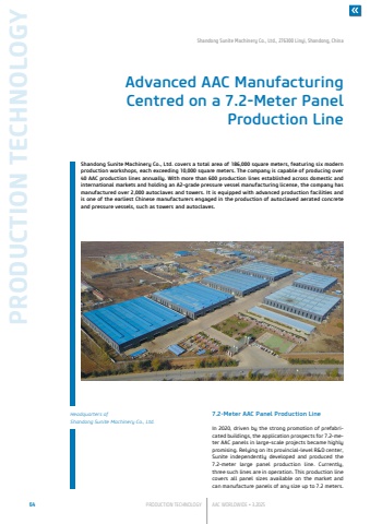 PRODUCTION TECHNOLOGY64 PRODUCTION TECHNOLOGY AAC WORLDWIDE %u2022 3.2025Shandong Sunite Machinery Co., Ltd., 276300 Linyi, Shandong, ChinaAdvanced AAC Manufacturing Centred on a 7.2-Meter Panel Production LineShandong Sunite Machinery Co., Ltd. covers a total area of 186,000 square meters, featuring six modern production workshops, each exceeding 10,000 square meters. The company is capable of producing over 40 AAC production lines annually. With more than 600 production lines established across domestic and international markets and holding an A2-grade pressure vessel manufacturing license, the company has manufactured over 2,000 autoclaves and towers. It is equipped with advanced production facilities and is one of the earliest Chinese manufacturers engaged in the production of autoclaved aerated concrete and pressure vessels, such as towers and autoclaves.7.2-Meter AAC Panel Production LineIn 2020, driven by the strong promotion of prefabricated buildings, the application prospects for 7.2-meter AAC panels in large-scale projects became highly promising. Relying on its provincial-level R&D center, Sunite independently developed and produced the 7.2-meter large panel production line. Currently, three such lines are in operation. This production line covers all panel sizes available on the market and can manufacture panels of any size up to 7.2 meters.Headquarters of Shandong Sunite Machinery Co., Ltd.