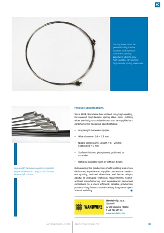 AAC WORLDWIDE %u2022 3.2025 PRODUCTION TECHNOLOGY 69Product specificationsSince 2018, Wandwire has utilized only high-quality, EU-sourced high-tensile spring steel coils. Cutting wires are fully customizable and can be supplied according to the following specifications:%u2022 Any length between nipples%u2022 Wire diameter: 0.6 %u2013 1.5 mm%u2022 Nipple dimensions: Length = 8 %u2013 20 mm, External %u00d8 = 5 mm%u2022 Surface finishes: phosphated, polished, or stranded%u2022 Options available with or without beadsOutsourcing the production of AAC cutting wires to a dedicated, experienced supplier can ensure consistent quality, reduced downtime, and better adaptability to changing technical requirements. Standardized manufacturing and experienced personnel contribute to a more efficient, reliable production process %u2013 key factors in maintaining long-term operational stability. %u25cfCutting wires must be geometrically precise, durable, and maintain consistent quality. Wandwire utilizes only high-quality, EU-sourced high-tensile spring steel coils.Wandwire Sp. z.o.o.Lipowa 832-050 Skawina, PolandT +48 794 687 101www.wandwire.comAny length between nipples is possible. Nipple dimensions: Length = 8 %u2013 20 mm, External %u00d8 = 5 mm.