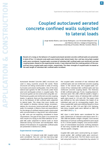 70 APPLICATION & CONSTRUCTION AAC WORLDWIDE %u2022 3.2025APPLICATION & CONSTRUCTIONExperimental investigation into earthquake and strong wind load casesCoupled autoclaved aerated concrete confined walls subjected to lateral loadsResults of a study on the behavior of coupled autoclaved aerated concrete confined walls are presented. A total of four 1:2 reduced-scale walls were tested under lateral loads. One- and two-story high coupled walls were considered. Coupled walls consisted of individual AAC confined walls and reinforced concrete coupling beams. Based on the experimental results, it was observed that the cracking pattern of the oneand two-story coupled walls were similar, respectively. The shear strength of coupled walls increased as the wall length of individual AAC confined walls increased.Jorge Varela-Rivera, Juan Cacep-Rodriguez, Luis Fernandez-Baqueiro and Joel Moreno-Herrera, College of Engineering, Autonomous University of Yucatan, Merida, Yucatan, MexicoAutoclaved Aerated Concrete (AAC) structures are used in many countries around the world. These structures are being constructed in areas of strong hurricanes and severe earthquakes. One of the main lateral load systems for AAC structures under those wind and earthquake actions is coupled walls. This structural system can be constructed using AAC confined masonry walls and reinforced concrete coupling beams. In general, there are few experimental studies on the behavior of AAC confined walls subjected to lateral loads. This shows that more studies are still needed to develop rational design recommendations for structures constructed with that type of walls. For example, in Mexico, there are requirements for the design of confined masonry walls constructed with concrete blocks or clay bricks, but unfortunately, AAC units are not explicitly considered in those requirements. The goal of this paper is to present the main results of a study on the shear behavior of coupled AAC walls subjected to lateral loads as those observed during hurricanes and earthquakes. More details of the behavior of coupled AAC confined walls are presented in Varela et al. (2025).Experimental investigationIn this study 1:2 reduced scale AAC coupled walls were considered. Two one- and two two-story high coupled walls were selected (Fig. 1). In the first case, the coupled walls consisted of two individual AAC confined walls and one reinforced concrete coupling beam. In the second case, the coupled walls consisted of four individual AAC confined walls and two reinforced concrete coupling beams. The thickness of AAC confined walls was 75 mm. Coupling beam dimensions were 150 x 200 x 500 mm (width x height x length). The aspect ratios of individual AAC confined walls were equal to 1.23 and 2.29. The aspect ratio was defined as the ratio between the height of an individual wall and its corresponding length. Onestory coupled AAC walls were defined based on those aspect ratios as CW1%u20131.23 and CW1%u20132.29. Similarly, two-story coupled walls were defined as CW2%u20131.23 and CW2%u20132.29 (Fig. 1).AAC class 4 solid blocks were considered for the walls. Dimensions of reduced-scale blocks were 75 x 100 x 300 mm (width x height x length). Cross section dimensions of vertical confining elements were equal to 75 x 110 mm (width x height). Cross section dimensions of intermediate horizontal confining elements of two-story coupled AAC walls were equal to 75 x 100 mm (width x height).Coupled AAC walls were constructed by an experienced worker. AAC confined walls were constructed in half running bond. The first block course was laid using both mortar in proportions by volume 1:3