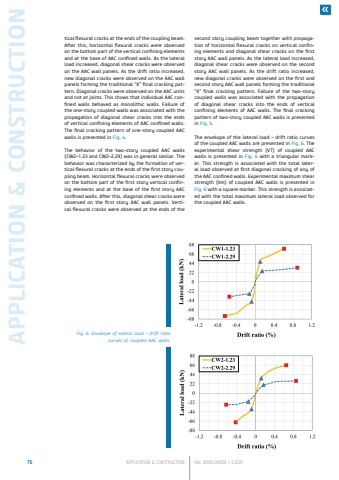 76 APPLICATION & CONSTRUCTION AAC WORLDWIDE %u2022 3.2025APPLICATION & CONSTRUCTIONtical flexural cracks at the ends of the coupling beam. After this, horizontal flexural cracks were observed on the bottom part of the vertical confining elements and at the base of AAC confined walls. As the lateral load increased, diagonal shear cracks were observed on the AAC wall panels. As the drift ratio increased, new diagonal cracks were observed on the AAC wall panels forming the traditional %u201cX%u201d final cracking pattern. Diagonal cracks were observed on the AAC units and not at joints. This shows that individual AAC confined walls behaved as monolithic walls. Failure of the one-story coupled walls was associated with the propagation of diagonal shear cracks into the ends of vertical confining elements of AAC confined walls. The final cracking pattern of one-story coupled AAC walls is presented in Fig. 4.The behavior of the two-story coupled AAC walls (CW2%u20131.23 and CW2%u20132.29) was in general similar. The behavior was characterized by the formation of vertical flexural cracks at the ends of the first story coupling beam. Horizontal flexural cracks were observed on the bottom part of the first story vertical confining elements and at the base of the first story AAC confined walls. After this, diagonal shear cracks were observed on the first story AAC wall panels. Vertical flexural cracks were observed at the ends of the second story coupling beam together with propagation of horizontal flexural cracks on vertical confining elements and diagonal shear cracks on the first story AAC wall panels. As the lateral load increased, diagonal shear cracks were observed on the second story AAC wall panels. As the drift ratio increased, new diagonal cracks were observed on the first and second story AAC wall panels forming the traditional %u201cX%u201d final cracking pattern. Failure of the two-story coupled walls was associated with the propagation of diagonal shear cracks into the ends of vertical confining elements of AAC walls. The final cracking pattern of two-story coupled AAC walls is presented in Fig. 5.The envelope of the lateral load %u2013 drift ratio curves of the coupled AAC walls are presented in Fig. 6. The experimental shear strength (VT) of coupled AAC walls is presented in Fig. 6 with a triangular marker. This strength is associated with the total lateral load observed at first diagonal cracking of any of the AAC confined walls. Experimental maximum shear strength (Vm) of coupled AAC walls is presented in Fig. 6 with a square marker. This strength is associated with the total maximum lateral load observed for the coupled AAC walls.Fig. 6: Envelope of lateral load %u2013 drift ratio curves of coupled AAC walls.