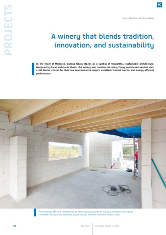 78 PROJECTS AAC WORLDWIDE %u2022 3.2025PROJECTSSmart Materials for Great WinesA winery that blends tradition, innovation, and sustainabilityIn the heart of Mallorca, Bodega Nacra stands as a symbol of thoughtful, sustainable architecture. Designed by local architects Mar%u00e8s, the winery was constructed using Ytong autoclaved aerated concrete blocks, chosen for their low environmental impact, excellent thermal inertia, and energy-efficient performance.From energy-efficient architecture to ideal ageing conditions, building materials like Ytong and Hebel AAC provide excellent properties for wineries and wine cellars alike.