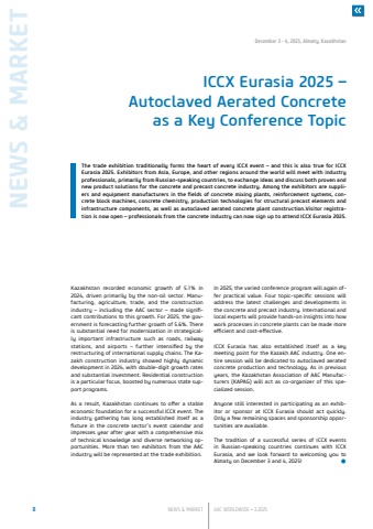 NEWS & MARKET8 NEWS & MARKET AAC WORLDWIDE %u2022 3.2025December 3 - 4, 2025, Almaty, KazakhstanICCX Eurasia 2025 %u2013 Autoclaved Aerated Concrete as a Key Conference TopicThe trade exhibition traditionally forms the heart of every ICCX event %u2013 and this is also true for ICCX Eurasia 2025. Exhibitors from Asia, Europe, and other regions around the world will meet with industry professionals, primarily from Russian-speaking countries, to exchange ideas and discuss both proven and new product solutions for the concrete and precast concrete industry. Among the exhibitors are suppli,ers and equipment manufacturers in the fields of concrete mixing plants, reinforcement systems, concrete block machines, concrete chemistry, production technologies for structural precast elements and infrastructure components, as well as autoclaved aerated concrete plant construction.Visitor registra,tion is now open %u2013 professionals from the concrete industry can now sign up to attend ICCX Eurasia 2025.Kazakhstan recorded economic growth of 5.1% in 2024, driven primarily by the non-oil sector. Manufacturing, agriculture, trade, and the construction industry %u2013 including the AAC sector %u2013 made significant contributions to this growth. For 2025, the government is forecasting further growth of 5.6%. There is substantial need for modernization in strategically important infrastructure such as roads, railway stations, and airports %u2013 further intensified by the restructuring of international supply chains. The Kazakh construction industry showed highly dynamic development in 2024, with double-digit growth rates and substantial investment. Residential construction is a particular focus, boosted by numerous state support programs.As a result, Kazakhstan continues to offer a stable economic foundation for a successful ICCX event. The industry gathering has long established itself as a fixture in the concrete sector%u2019s event calendar and impresses year after year with a comprehensive mix of technical knowledge and diverse networking opportunities. More than ten exhibitors from the AAC industry will be represented at the trade exhibition.In 2025, the varied conference program will again offer practical value. Four topic-specific sessions will address the latest challenges and developments in the concrete and precast industry. International and local experts will provide hands-on insights into how work processes in concrete plants can be made more efficient and cost-effective.ICCX Eurasia has also established itself as a key meeting point for the Kazakh AAC industry. One entire session will be dedicated to autoclaved aerated concrete production and technology. As in previous years, the Kazakhstan Association of AAC Manufacturers (KAPAG) will act as co-organizer of this specialized session.Anyone still interested in participating as an exhibitor or sponsor at ICCX Eurasia should act quickly. Only a few remaining spaces and sponsorship opportunities are available.The tradition of a successful series of ICCX events in Russian-speaking countries continues with ICCX Eurasia, and we look forward to welcoming you to Almaty on December 3 and 4, 2025! %u25cf