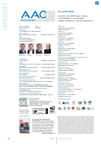 82 IMPRINT AAC WORLDWIDE %u2022 2.2025IMPRINTPlace of publication: ISSN:Cologne, Germany 2569-7064 Management:Dr.-Ing. Holger Karutz %u00b7 Alexander OlbrichEditor-in-Chief:Dipl.-Ing. (FH) Michael von Ahlen editor@aac-worldwide.comEditors:Dipl.-Ing. Mark K%u00fcppers Prof. Hans-Dieter Beushausen Dipl.-Ing. Juergen GlaesleAdvertisement:Gerhard Kl%u00f6ckner sales@aac-worldwide.comDesign:Andr%u00e9 Besgens %u00b7 Carmen Frick %u00b7 Alex Konn production@ad-media.deAccountancy:Sandra Borchert %u00b7 Maurice Borchert accountancy@ad-media.deSubscription service:Maurice Borchert %u00b7 Sabrina Pontalti subscription@ad-media.deEvent management:Bahram Ghaleh events@ad-media.de External Data Protection Officer:Ben Green Consultancy UG dataprotection@ad-media.de Annual subscription (4 issues):115,- %u20ac including postage, single copy price: 32,- %u20ac plus postageBank connection:Deutsche Bank AG, Account no.: 6800080, BIC: 370 700 24SWIFT CODE: DEUTDEDBKOE, IBAN-No.: DE88370700240680008000Printing house / enclosures and supplement delivery:TheissenKopp GmbH Am Kieswerk 3 %u00b7 40789 Monheim %u00b7 GermanyPostmaster | send address changes to:ad-media GmbH %u00b7 Industriestra%u00dfe 180 %u00b7 50999 Cologne %u00b7 GermanyPartnering Associations: Publishing Company:ad-media GmbHIndustriestr. 180 %u00b7 50999 Cologne %u00b7 GermanyT +49 2236 962390 %u00b7 F +49 2236 962396info@ad-media.de %u00b7 www.ad-media.dewww.aac-worldwide.comAll Rights reserved. No part of this publication may be reproduced, stored in a retrieval system, or transmitted in any form or by any means, electronic, mechanical, photocopying, recording or otherwise, without the prior permission of the copyright owner. Authors who submit texts and/or pictorial material (%u201ematerial%u201c) for publication grant ad-media the non-exclusive right, unlimited in time and territory, to publish the material. This applies to the media published by ad-media as well as to international trade publications in which employees of ad-media collaborate, and includes both the printed and online sector, including mobile applications for smartphones, etc. The authors guarantee that they possess all rights to the material submitted that are necessary for the aforementioned granting of rights to ad-media. The authors indemnify ad-media against all claims asserted by third parties on account of usage of the material in accordance with these general terms and conditions. ad-media accepts no liability for the correctness of the contents of the material submitted by the authors. All views expressed in this journal are those of the respective contributors and are not neccesarily the opinions of the publisher, neither do the publishers endorse any of the claims made in the advertisements.AAC WORLDWIDEIndustriestr. 180 %u00b7 50999 Cologne %u00b7 GermanyT +49 2236 962390 %u00b7 F +49 2236 962396info@aac-worldwide.com %u00b7 www.aac-worldwide.comDipl.-Ing. (FH) Michael von AhlenDipl.-Ing. Mark K%u00fcppersProf. H.-D. BeushausenDipl.-Ing. Juergen GlaesleAsiaZhang Jinying %u00b7 M +86 13920414614 asia@aac-worldwide.comBrazilSoy Cho %u00b7 M +55 11 98965 3005 brazil@aac-worldwide.com EurasiaTimur Dmitrov %u00b7 T +7 4822630039 eurasia@aac-worldwide.comIndiaMukund Joshi %u00b7 T +91 9158010000 india@aac-worldwide.comItalyGabriele Pianta %u00b7 T +49 2236 962390 italy@aac-worldwide.comKoreaMoon-Hi Lee %u00b7 M +49 173 5356753 %u00b7 M +82 10 42806473 korea@aac-worldwide.comLatin America (without Brasil) / South West EuropeGabriele Pianta %u00b7 T +49 2236 962390 southwesteurope@aac-worldwide.comMiddle EastKambiz S. Pour Kardan %u00b7 T +98 21 88888191 middleeast@aac-worldwide.comNorth AmericaJudi Taylor %u00b7 T +1 770-672-7082 northamerica@aac-worldwide.comOceaniaMichael Khrapko %u00b7 T +64 9 629 5992 oceania@aac-worldwide.comPoland / Czech RepublicAgnieszka Spychalska %u00b7 T +48 697 619111 poland@aac-worldwide.comSouth East AsiaMichael Lazar %u00b7 T +65 6861 5668 southeastasia@aac-worldwide.comSouthern AfricaProf. Hans-Dieter Beushausen %u00b7 T +27 82 7375057 southafrica@aac-worldwide.com TurkeyGabriele Pianta %u00b7 T +49 2236 962390turkey@aac-worldwide.com4 www.cpi-worldwide.com2025Concrete Plant InternationalWorldwide English EditionICCX SPECIAL Save the Date %u2013 ICCX T%u00fcrkiye 2026 | ICCX Academy Baku 2026 CONCRETE TECHNOLOGY Utilizing incineration ashes CONCRETE PRODUCTS Innovation as a growth driver CONCRETE PIPES AND MANHOLES New Radial Press for manufacturing concrete pipes at Viet Cuong Concrete in Vietnam PRECAST CONCRETE ELEMENTS Precast carbon concrete parts from the battery mould MIXED AND COMPACTED Concrete %u2013 Well DoneExpert in block/paver machinesand robotic solutions. www.quadra-concrete.comCPI Concrete Plant International / CPI worldwide is the only trade journal for the concrete industry that is published worldwide in more than 10 language and regional editions. CPI worldwide is addressing the decision makers in this industry. Every issue of CPI worldwide refers to concrete technology, concrete products, concrete pipes and precast concrete.www.cpi-worldwide.comFurther publications:Printed in Germany. Published since 2018 by ad-media GmbH.Printed product CO%u2082 compensatedklima-druck.deID-No. 24162018 PEFC/04-31-1020PEFC RecycledThis product is fromrecycled sourceswww.pefc.co.ukwww.kapag.kzMasa PRS: Our latest milestone connects two target groups.The new Production Reporting System foroperator and management levels of Masa plants.When it comes to mechanical engineering for thebuilding materials industry %u2013 just aks the concrete heads!Aerated Concrete Autoclaved www.aac-worldwide.com1 | 2025News & Markets With Masa WhiteHub, a unique supplier of AAC and sand-lime brick plants is emerging in EuropeScience & Innovation The availability of steam waste energy generated during AAC production Production TechnologyState-of-the-art solutions for aging Hebel plants %u2013 Part 2 Application & Construction Safety of reinforced AAC lin