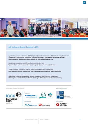 AAC WORLDWIDE %u2022 3.2025 NEWS & MARKET 9Partner OrganizationsSupportersOrganisationEURASIA 2025www.iccx.orgCooperation partners and sponsorsAAC Conference Session: December 4, 2025Vyacheslav Lazarev %u2013 President of KAPAG (Kazakhstan Association of AAC Manufacturers), KazakhstanKazakhstan's construction industry in the regional context: concrete and autoclaved aerated concrete market development, opportunities for international partnershipKazakhstan Association of AAC Manufacturers (speaker tba)Bottlenecks in autoclaved aerated concrete production %u2013 causes and solutionsJ%u00fcrgen Oecknick - Managing Director of PSA Zurich Area GmbH, SwitzerlandFrom manufacturing to marketing of AAC %u2013 about two key moments of great importanceMakhambet Kaisarbek Kuralbekuly, General Manager of Sauran Bricks, KazakhstanModern production technologies for the challenges of tomorrow%u00b4s construction industryOfficial Airline